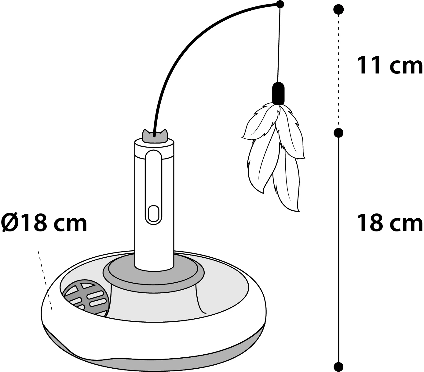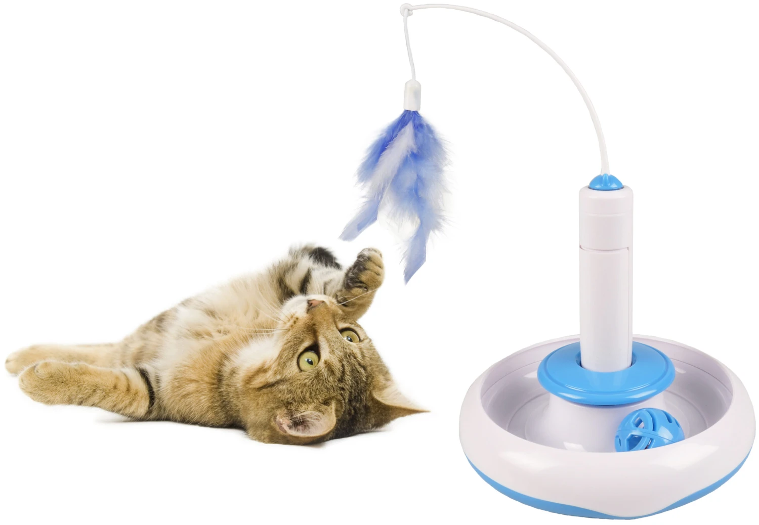 Jouet interactif pour les chats. Contient une boule bleue avec une cloche. Il est motorisĂ© : les ressorts tournent de manière imprĂ©visible dans le sens des aiguilles d’une montre et dans le sens inverse. Vous pouvez enlever la tige avec les plumes pour jouer vous-mĂŞme avec votre chat. NĂ©cessite 2 piles AAA, non incluses.