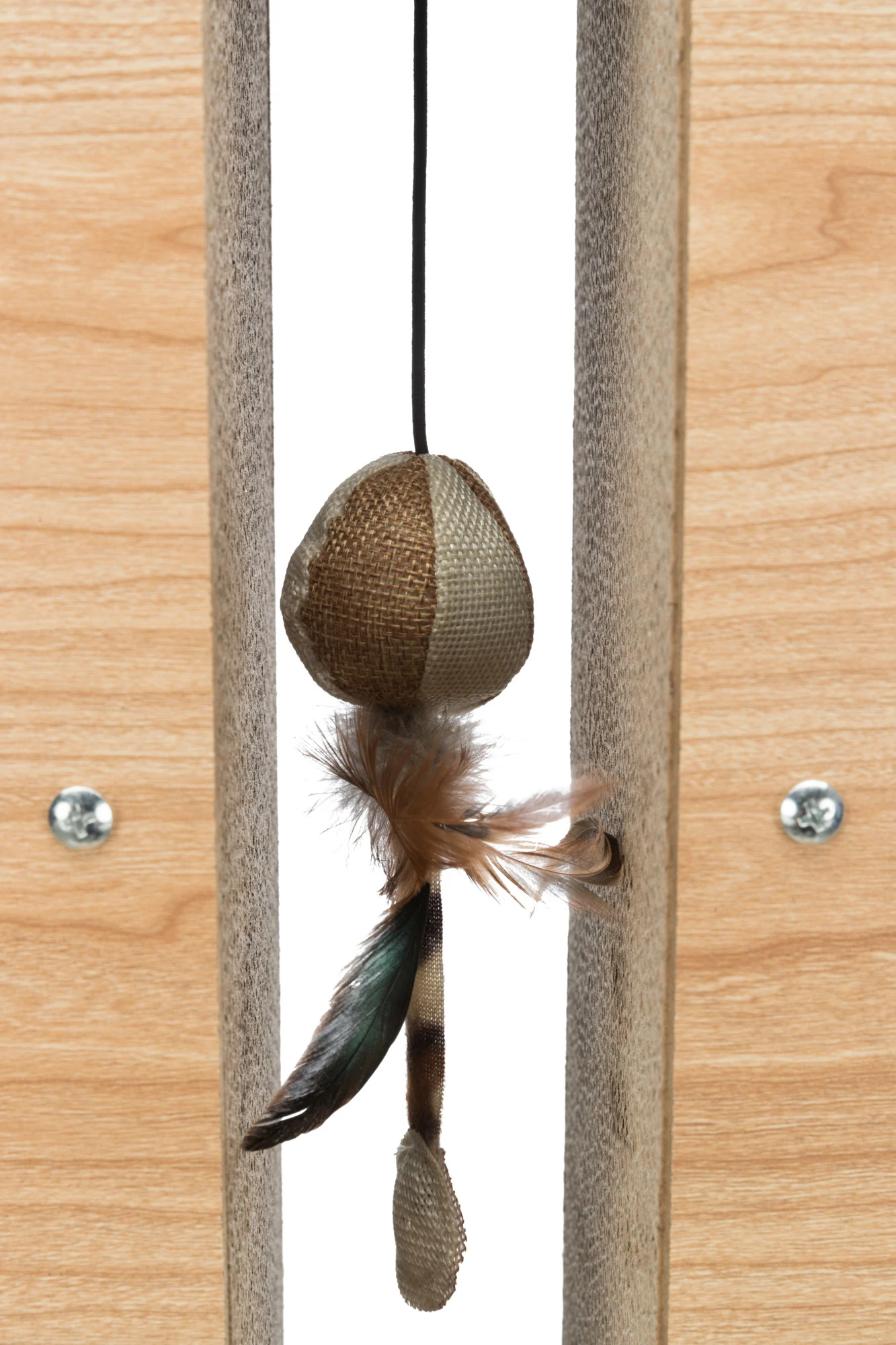 Colonne griffoir avec griffoir carton avec jouet suspendu à un fil.
